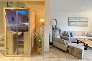Erdgeschoss: Wohnzimmer mit Kaminofen, Infrarot-Kabine, offener Küche, Essecke und Smart-TV. 1 Duschbad, Flur und Abstellraum mit Waschmaschine und Trockner stehen zur Verfügung. Die Terrasse ist nach Süden ausgerichtet und verfügt über einen Strandkorb und Gartenmöbel. Kaminofen und Weinkühlschrank.