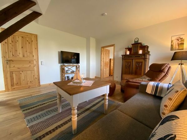 Ihr betretet die Wohnung hin zum Wohnzimmer im gemütlichen Landhausstil, mit einer durch stilechte, romantische Holzbalken räumlich getrennten Küche und einem Essbereich.