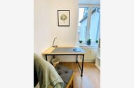 Auf knapp 40qm bietet es ein helles Wohn- und Schlafzimmer (Bett, Sofa, Kommode, TV) nach Westen mit zwei großen Altbaufenstern, ein Arbeitszimmer mit Schreibtisch [&] Bücherregal nach Osten mit Blick in einen grünen Innenhof, ein modernes Bad (Dusche, WC, Waschbecken, Waschmaschine und Wäscheständer) und eine voll ausgestattete Küche mit Spüle, Kühlschrank, Ofen, Ceranfeld-Herd und Essecke inkl. Töpfe, Teller, Geschirr, Besteck, Wasserkocher, Toaster, Espressomaschine, etc..