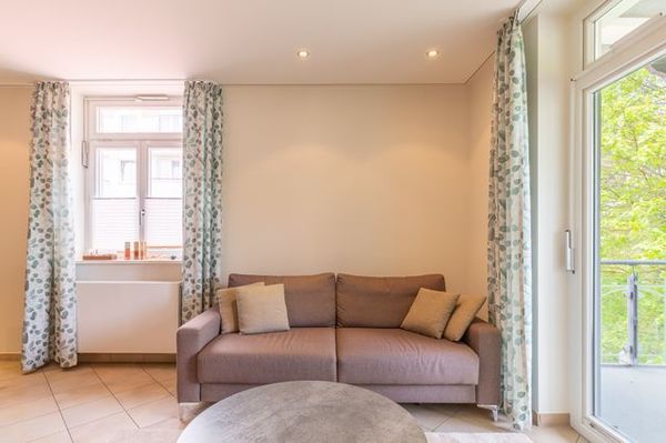 Das Wohnzimmer bietet Ihnen einen offenen und freundlichen Blick über die Anlage in Richtung Ostsee. Der großzügige Balkon ist nur eines der vielen Highlights Ihres Appartements. Sowohl im Wohn- als auch im Schlafzimmer steht je 1 moderner Flatscreen-Fernseher zur Verfügung.