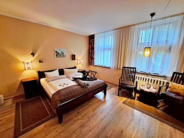 Herzlich willkommen in unserem geräumigen Doppelzimmer im Erdgeschoss der Pension! Hier erwartet Sie eine angenehme Atmosphäre, die durch die stilvollen Akazienholzmöbel ein leicht afrikanisches Urlaubsgefühl vermittelt. Das Zimmer ist komfortabel ausgestattet mit einem gemütlichen Doppelbett, einladenden Sitzgelegenheiten und einem Flachbild-TV, damit Sie sich rundum wohlfühlen können. Das angrenzende Tageslicht-Bad bietet Ihnen eine erfrischende Dusche, WC und einen Fön für Ihre Komfort. Für Ihren Aufenthalt steht Ihnen unser kostenloses W-LAN zur Verfügung, sodass Sie jederzeit online sein können. Zudem ist ein kostenfreier Pkw-Stellplatz für Sie inklusive.