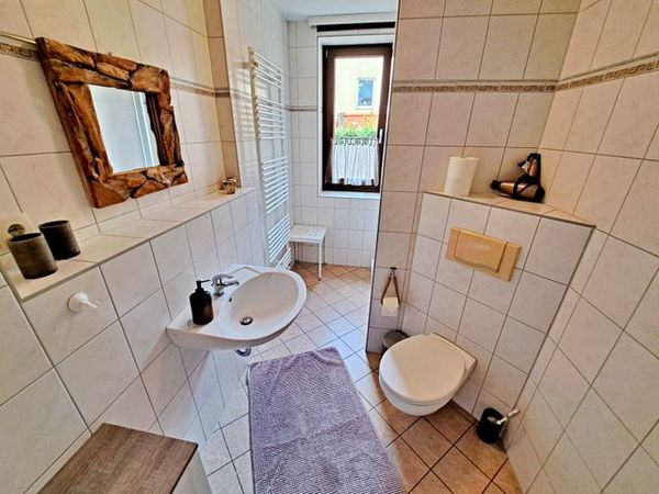 Herzlich willkommen in unserer charmanten 60 qm großen Ferienwohnung im Erdgeschoss! Hier erwartet Sie ein einladendes Wohnzimmer, das mit einer bequemen Sofa-Landschaft (Aufbettung für 1 Person) und Flachbild-TV ausgestattet ist - ideal für entspannte Stunden. Für gesellige Mahlzeiten steht Ihnen ein Esstisch mit vier Stühlen zur Verfügung. Das separate Schlafzimmer lädt mit einem gemütlichen Doppelbett zum Träumen ein. In der praktischen Pantryküche finden Sie alles, was Sie für die Zubereitung kleiner Gerichte benötigen, darunter ein 2-Platten-Ceranherd, Kühlschrank und ein kleiner Backofen. Das Tageslicht-Bad mit Dusche und WC sowie einem Fön rundet das Angebot ab und sorgt für zusätzlichen Komfort. Für Ihre Unterhaltung und Verbindung zur Außenwelt steht Ihnen unser kostenloses W-LAN während Ihres gesamten Aufenthalts zur Verfügung. Ihr Auto findet direkt am Haus einen sicheren Parkplatz.