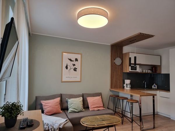 Die Studio-Ferienwohnung (26m2) befindet sich im zweiten Stock eines Gebäudes mit Aufzug. Es besteht aus einem Zimmer mit Kochnische, Bad und Balkon. Ausgestattet mit einem Doppelbett mit einer Matratze (140x200cm) und einem Schlafsofa (Fläche, wenn ausgeklappt 140x195cm), Sessel, Couchtisch. In der Küchenzeile befinden sich eine hohe Arbeitsplatte und 3 hohe Hocker sowie ein Induktionsherd mit 2 Kochstellen, ein Kühlschrank, ein Wasserkocher, eine Transferkaffeemaschine und ein Toaster. Badezimmer mit Toilette, Duschkabine, Waschbecken und Waschmaschine.