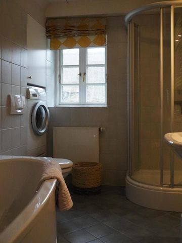 Die Wohnung ist modern gehalten, während Holzsprossenfenster und einzelne Elemente dir dennoch das Gefühl geben, dass du dich in einem über 200 Jahre alten Reetdachhaus aufhältst. Diese Verbindung vom traditionellen Friesenhaus und moderner Ausstattung verleiht der Wohnung eine besondere Persönlichkeit und macht sie zu einem Ort, der Komfort und Gemütlichkeit vereint.Über den Flur, der durch eine große Glastür vom Wohnraum abgetrennt ist, gelangst du zu den beiden Schlafzimmern. Das erste Schlafzimmer verfügt über ein 1,60 Meter breites Bett, während das zweite Zimmer mit zwei Einzelbetten ausgestattet ist. Beide Zimmer sind mit praktischen Einbauschränken versehen. Ein gemeinsames Badezimmer mit Dusche und Badewanne ist ebenso vom Flur aus erreichbar.Der große Ess- und Wohnraum mit einer voll ausgestatteten Küche bietet viel Platz und Komfort zum gemeinsamn Kochen und Essen.