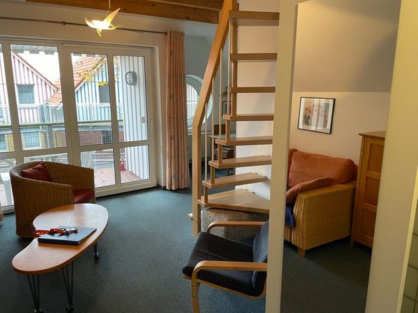 Dieses gepflegte Nichtraucherappartement, innerhalb der Ferienanlage 'Seeblick', befindet sich im 2.OG eines Gästehauses (Baujahr 1999) und verfügt über Dusche/WC, Wohnraum mit TV, Radio,offener Küche ( Kaffeemaschine, Kühlschrank usw.) und Zugang zum möblierten Balkon, sowie über zwei Schlafzimmer. Sie ist zentralbeheizt und für 2-4 Personen geeignet (Doppelbett im Schlafzimmer und 2 Einzelbetten im Schlafboden). Bettwäsche und Handtücher im Set sind Bestandteil der Buchung.
