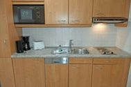 Im Wohnraum integrierte Einbauküche, ausgestattet mit: 2-Platten-Kochfeld, Mikrowelle, Dunstabzugshaube, Kühlschrank mit Gefrierfach, Geschirrspüler, Toaster, Kaffeemaschine, Wasserkocher und Küchenutensilien
