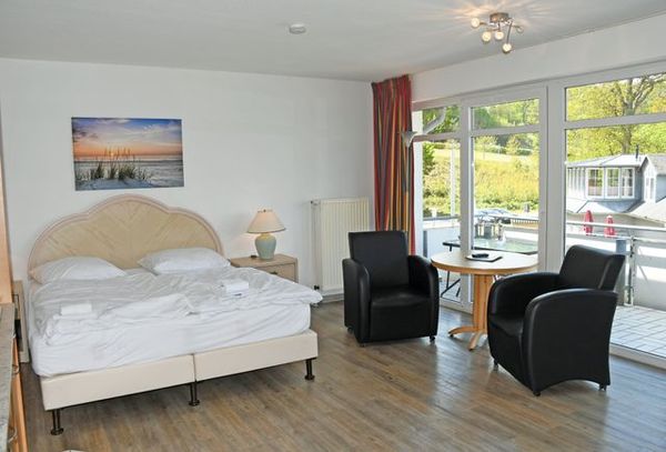 Unsere ruhig gelegenen, hellen und lichtdurchfluteten 1-Raum-Ferienwohnungen mit Balkon sind wie folgt ausgestattet: