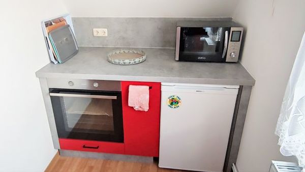 Bei der Küche handelt es sich um eine moderne zweigeteilte Einbauküche mit Herd und Backofen und einem Kühlschrank mit Gefriermöglichkeit, zusätzlich befindet sich in der Küche ein Wasserkocher, eine Kaffeemaschine und eine Mikrowelle.