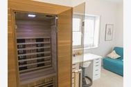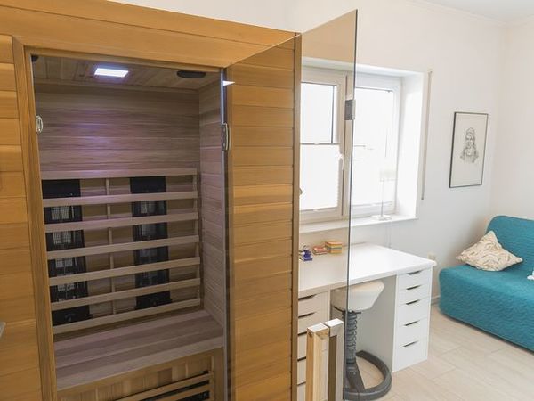Das Haus verfügt über drei Schlafräume mit je einem Doppelbett und mit einem ausziehbaren Schlafsofa 140x200 cm. Das Schlafsofa befindet sich im Kinderzimmer und dort können Sie in der Infrarotsauna Wärme tanken. Oder nutzen Sie den Schreibtisch im Rahmen ihrer Workation.