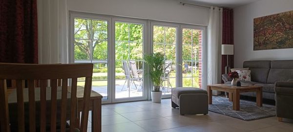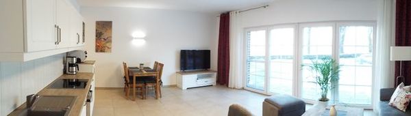 Die Ferienwohnung 3 ist ebenerdig und barrierefrei konzipiert und ist großzügige 70 qm groß. Sie lädt mit ihrer modernen Einrichtung und den warmen Farben zum Erholen und Entspannen ein. Die Wohnungen wurden mit viel Liebe hochwertig eingerichtet. Im großzügigen Wohnbereich finden Sie eine gemütliche Sitzecke mit einem 2-Sitzer und einem extra Sessel; natürlich auch einen Couchtisch. Hier findet sich auch der Flachbild-TV. In der offenen Landhausküche müssen Sie auf Nichts verzichten. Es gibt einen Elektroherd, einen Kühlschrank mit Gefrierfach, einen Geschirrspüler, eine Mikrowelle, eine Kaffeemaschine und auch einen Wasserkocher. Sie finden hier alles vor, was Sie zum Wohlfühlen und Kochen benötigen.