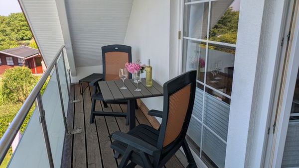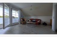 Die 65 qm große Ferienwohnung im ersten Obergeschoss verfügt über einen Wohnraum mit gemütlicher Sitzecke und TV, eine angrenzende Küchenzeile, ausgestattet mit Kühlschrank (mit Gefrierfach), Ceran-Herd, Backofen und vielen weiteren Dingen sowie einen Essplatz. Das Schlafzimmer verfügt über eine Doppelbett und TV. Bad mit Badewanne und WC. Ein Balkon (Südwest-Lage) rundet das Angebot der Wohnung ab.