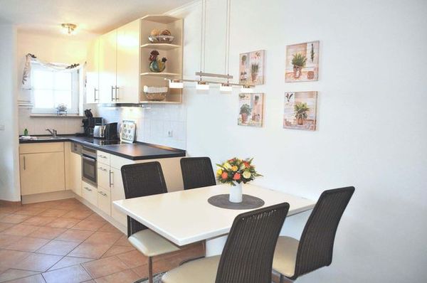 Wohnzimmer: 2 Relaxsessel, 4 Plattenherd mit Ceranfeld und Backofen, 4 Stühle, Anrichte, aus dem Küchenfenster Blick aus Meer, Bügelbrett, Bügeleisen, Couch, Couchtisch, Dunstabzugshaube, Einbaukleiderschrank, Einbauküche, Einbauregal, elektrische Zitronenpresse, Esstisch, Flachbildschirm, Fliegenschutzgitter nur an den Fenstern, Handmixer, Kabel-TV, Kaffeemaschine, Kaffeepadmaschine, Kühlschrank, Senseo Kaffeemaschine, Spülmaschine, Staubsauger, Stereoanlage mit CD-Player, Toaster, Wasserkocher