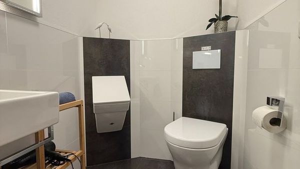 Badezimmer: Der separate Sanitärbereich bietet Ihnen einen modernen Waschtisch mit berührungsloser Armatur, ein WC und ein Pissoir. Ein großzügiger, beleuchteter Spiegel ergänzt das Badezimmer.