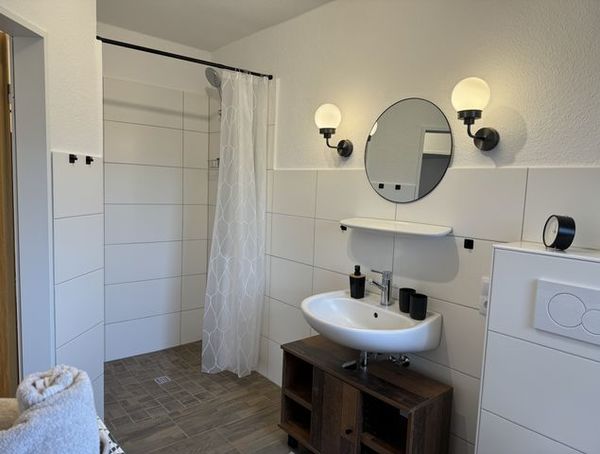 Das Bad ist ausgestattet mit einer ebenerdige Dusche, Fön, Waschmaschine und Trockner.