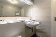 Das helle Badezimmer verfügt über eine Dusche und ein Fön ist ebenfalls vorhanden.