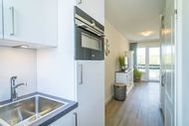 Die offene, neu gestaltete Einbauküche mit Fenster ist mit einem 4-Platten-Ceranfeld, einer Backofen-Mikrowellen-Kombi, einem großzügigen Kühlschrank mit 3-Sterne-Gefrierfach und einer Geschirrspülmaschine ausgestattet. Zur Grundausstattung zählen zudem eine Kaffeemaschine (auch für Kaffeepads geeignet), ein Wasserkocher, ein Toaster und sämtliches Küchenzubehör.