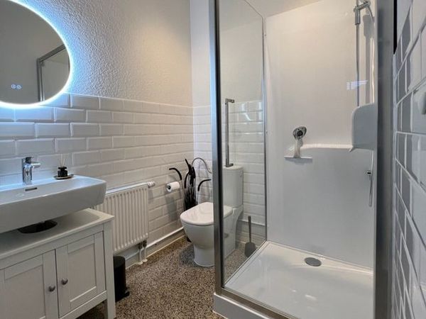 Das moderne Badezimmer verfügt unter anderem über Waschbecken, WC, Dusche und eine Waschmaschine. Außerdem stellt der Gastgeber frische Seifen bereit.