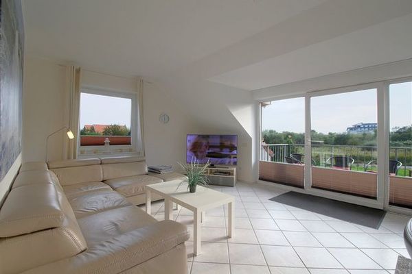Der sonnige Wohn- und Essbereich mit Ausgang zum Balkon mit Blick auf den Nordseedeich, eine gut ausgestattete separate Küche und ein modernes Duschbad mit Fenster sorgen für erholsame Urlaubstage.