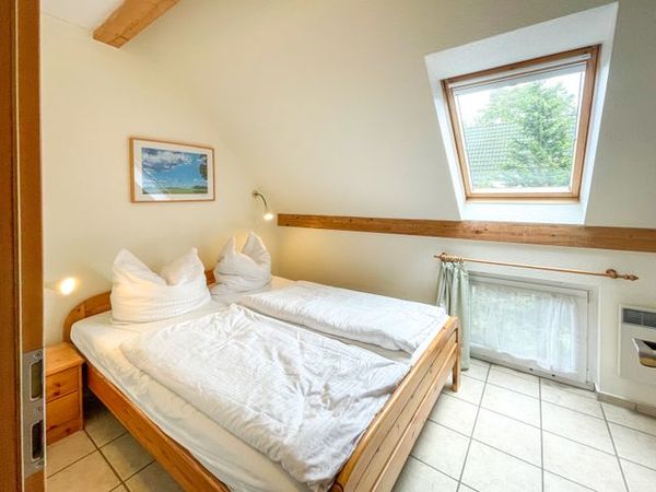 Neben dem Wohnzimmer liegt ein Schlafzimmer mit zwei Einzelbetten (je 100x200cm), einem großen Kleiderschrank und einer Kommode mit einem kleinen Flat-TV. Anschließend finden Sie das zweite Schlafzimmer mit einem großen Doppelbett (zwei Matratzen je 90x200cm) und einem Sideboard. Zuletzt kommen Sie vom Flur in das Badezimmer, ausgestattet mit einer Dusche, einem WC und ein Waschbecken.