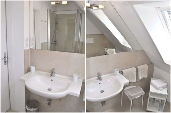 Bad 1: Dusche, Duschkabine, Fön, Handtuchständer, Hocker, Rollwagen, Spiegel, Waschbecken, WC
