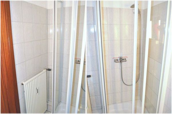 Bad 1:                   Dusche, Duschkabine, Hängeschrank, Spiegel, Waschbecken, WC