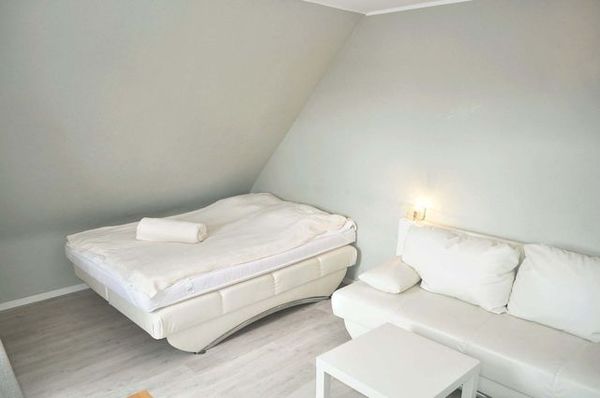 Wohnzimmer: 2 Kommoden, 2 Leselampen, 2 Plattenherd, 2 Stühle, Couch, Couchtisch, DVBT-TV, Flachbildschirm, Garderobe, Geschirr, Kaffeemaschine, Kleiderschrank, Kochtöpfe, Küchenzeile, Kühlschrank mit Gefrierfach, Schlafcouch 2,00 x 1,60 m mit Matratze, Stereoanlage mit CD-Player und USB-Anschluss, Tisch, Toaster, Wasserkocher