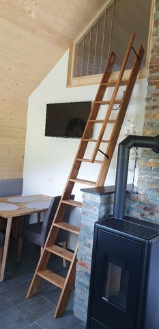 Das gemütliche Ferienhaus ist im Wohnbereich mit einem Pelettofen, Esstisch mit Bank und Stühlen sowie einem Sofa und TV ausgestattet.