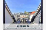 Die 61m² große Maisonettewohnung Schoner 13 erstreckt sich über das Ober- und Dachgeschoss des Hauses und eignet sich ideal für bis zu 3 Personen und ein Kleinkind bis 3 Jahre. Im unteren Bereich befinden sich das Schlafzimmer mit Doppelbett und Kleiderschrank sowie das helle Badezimmer mit Fenster und Dusche.