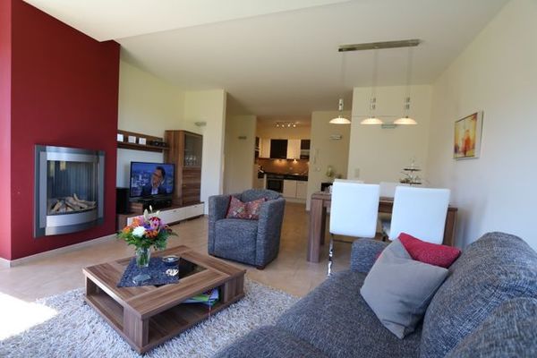 Genießen Sie Ihre Auszeit im Wellnessambiente mit Panoramablick über die Landschaft, und das zu jeder Jahreszeit. Die gemütlich eingerichtete Wohnung befindet sich im Erdgeschoß der Villa Harmonie. Diele, Wohn-/Essbereich mit Küche, 2 Schlafzimmer, Bad und Abstellraum verteilen sich großzügig auf ca. 92 qm. Die Einrichtung und Dekoration sind mit viel Liebe zum Detail aufeinander abgestimmt, schaffen ein wohnliches Ambiente und tragen so zu Wohlbehagen, guter Laune und Frohsinn bei. Im offenen Wohn-/Essbereich entspannen Sie auf dem Sofa vor dem Kamin, der Esstisch mit 4 Stühlen lädt zum gemütlichen Essen ein oder auch zum geselligen Beisammensein bei Gesellschaftspielen . Flatscreen-TV und DVD-Player sorgen für Unterhaltung. Die Ausstattung der offenen Einbauküche lässt keine Wünsche offen: Geschirr und Besteck sind ausreichend vorhanden. Weiterhin beinhaltet die Küche einen Herd mit Ceran-Kochfeld und Umluft-Backofen, ein Raclette und eine Mikrowelle für die schnelle Küche, eine Kühl/Gefrierkombination und eine Spülmaschine. Die gemütlichen Schlafzimmer sind jeweils mit Doppelbett, 2 Nachttischen und Kommode ausgestattet. In den dreiteiligen Schlafzimmerschränken lässt sich der Inhalt des Reisegepäcks nebst Koffer spielend verstauen. Beide Schlafzimmer verfügen über einen Flatscreen-TV. Die Laminatfußböden sorgen für eine reizarme Atemluft , die Fliegengitter für ruhige Nächte bei geöffnetem Fenster. Das Bad ist eines der Highlights dieser Wohnung, denn hier befindet sich ein kleiner SPA-Bereich. Die Familiensauna, die ebenerdige verglaste Raindance-Wellnessdusche, der große Designerwaschtisch und der Handtuchwärmer lassen keine Wünsche offen. Auf der umlaufenden Terrasse können Sie sowohl in der Morgen-, als auch in der Mittagssonne die phantastische Aussicht auf das nahe Wäldchen und den Golfplatz genießen. Der Gartentisch mit 4 Stühlen, 2 Gartenliegen, der Strandkorb und der große Sonnenschirm laden zum Verweilen ein. Wie wär's mit einem leckeren Barbecue? - der Grill wartet schon. Stellen Sie Ihre Fahrräder und Golfbags gerne im abschließbaren Schuppen unter. Ihr Fahrzeug parken Sie auf dem eigenen Parkplatz direkt neben dem Haus. Waschmaschine und Wäschetrockner finden Sie im Hauswirtschaftsraum zur kostenlosen Nutzung.