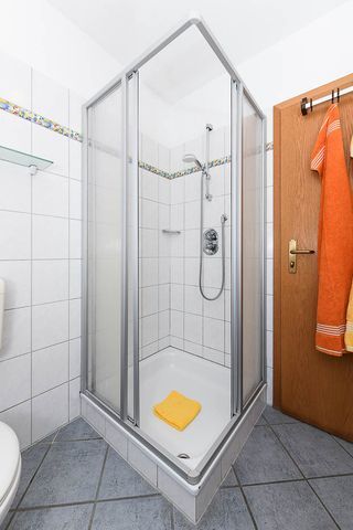 Badezimmer mit Dusche, Waschtisch und WC