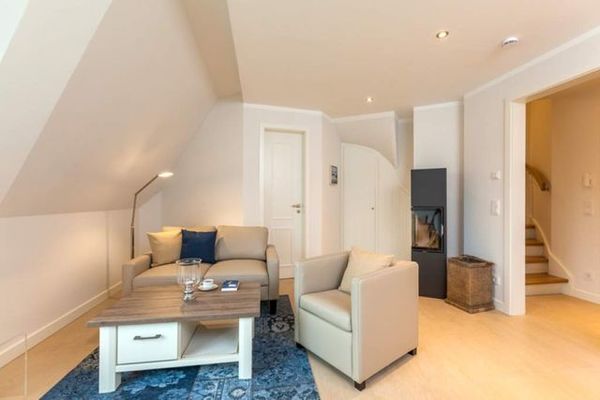 Der Wohnbereich hat eine komfortable Ledercouchgarnitur, einen gemütlichen Kaminofen, eine offene Küche mit separatem Essbereich und Zugang zum Südostbalkon mit Strandkorb.