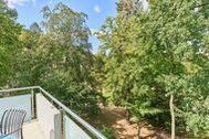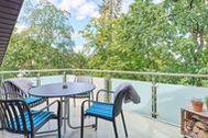 Das große Wohnzimmer verfügt über eine Essecke und hat einen Zugang zum möblierten Balkon, von dem aus Sie zu jeder Jahreszeit einen herrlichen Blick in den Stadtpark genießen können. Wenn Sie eine Tüte Erdnüsse mitbringen, dann können Sie zu gewissen Zeiten die Stadtwald-Eichhörnchen auf unserem Balkon füttern.