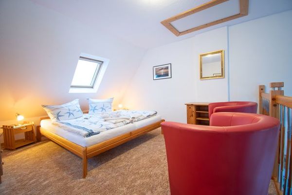 Zimmer 1 im Erdgeschoss mit einem Doppelbett 200x200, Zimmer 2 mit einem Doppelbett in der Größe 160x200 Zimmer 3 und Zimmer 4 haben je 2 Einzellbetten in den Maßen 90x200. Der fünfte Schlafraum befindet sich auf der Galerie über dem Speiseraum, ist über eine gesonderte Treppe erreichbar und hat ein Doppelbett in Größe 180x200.