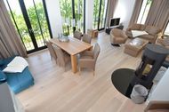 Der gesamte Wohn-/Essbereich wurde so ausgerichtet, dass man die Ostsee immer fest im Blick hat. Dies gilt für die bequemen Designer - Ledermöbel von E. Schillig genauso wie für den Essbereich und das separate Faltsofa in petrol, das ausziehbar ist und bei Bedarf Platz für 2 Personen bietet. Gerade auch in der etwas kälteren Jahreszeit sorgt ein Schweizer Luxuskaminofen mit Rundum-Glaseinsatz für Entspannung pur. Der Blick, die Wärme des Ofens und die beeindruckende Ausstattungsqualität der Suite sorgen auch abseits der Hochsaison für einen erholsamen Urlaub und wunderschöne Tage auf Rügen.