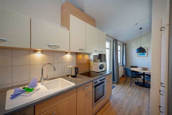 Appartement 11: Dieses schöne 2-Raum-Appartement verfügt über eine Wohnfläche von ca. 55 m² und befindet sich im Dachgeschoss des Vorderhauses mit einer möblierten großen Dachterrasse zur West-Seite. Hier lädt ein Strandkorb zum Sonnenbaden ein. Der helle, freundliche Wohnraum ist mit einer bequemen Schlafcouch (die als Aufbettung für 2 Personen genutzt werden kann), zwei Sesseln, einem Flachbild-TV, einer Mini-Stereoanlage mit CD-Player und einem Esstisch passend für die Personenanzahl in der Wohnung ausgestattet. Die harmonisch im Wohnbereich integrierte Küchenzeile ist ausgestattet mit einem Kühlschrank mit Gefrierfach, einem 4-Platten-Cerankochfeld, einem Backofen, einer Geschirrspülmaschine, einer Mikrowelle, Wasserkocher, Kaffeemaschine, Toaster und diversem Kleininventar, das die Küchenausstattung komplettiert. Ihr Appartement bietet darüber hinaus ein separates Schlafzimmer mit einem bequemen Doppelbett und ausreichend Platz für Ihre Garderobe sowie ein modernes Badezimmer mit Dusche/WC, Waschtisch und Haartrockner. Alle Böden sind entweder gefliest oder mit einem modernen Laminat in Holzoptik ausgestattet. Ein Internetanschluss per W-LAN steht Ihnen im Appartement zur Verfügung. Ein PKW-Stellplatz pro Appartement steht auf dem Grundstück kostenfrei bereit. Das Appartement ist ideal geeignet für 1-4 Personen. 1 kleines Haustier ist hier gegen kleine Gebühr ebenfalls herzlich willkommen!