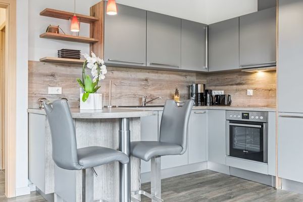 Der offene Küchenbereich ist geschmackvoll und umfangreich ausgestattet. Die Küche verfügt über einen 4- Platten- Herd, Backofen, Kaffeemaschine, Wasserkocher, Toaster, Geschirrspüler und sonstige Küchenutensilien.