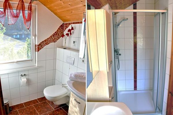 Damit es auch bei voller Hütte immer ganz entspannt zugeht, gibt es im Ober- und im Untergeschoss jeweils ein Bad mit Dusche/WC und Waschtisch.