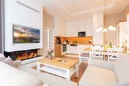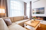 Ein großzügiger Wohnbereich mit einem exklusiven Gaskamin erwartet Sie bereits, sodass Sie eine angenehme Wohlfühlatmosphäre das gesamte Jahr über genießen. Eine bequeme Couchgarnitur und ein Flat-TV runden den Komfort perfekt ab und laden zum Entspannen und Füße hochlegen ein. Das helle Drei-Zimmer-Appartement hat eine Größe von 60 Quadratmetern und liegt im Hochparterre der Villa Waldschloss. Die vollausgestattete Küche, welche speziell von einem einheimischen Tischler angefertigt wurde, ergänzt die Annehmlichkeiten dieses neuen Appartements mit allen Raffinessen: Backofen, Mikrowelle, Kühlschrank mit Gefrierfach, Toaster, Wasserkocher, Kaffeemaschine sowie einem Essplatz für 5 Personen mit Blick in den gegenüberliegenden Park.