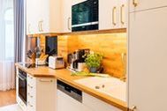 Ein großzügiger Wohnbereich mit einem exklusiven Gaskamin erwartet Sie bereits, sodass Sie eine angenehme Wohlfühlatmosphäre das gesamte Jahr über genießen. Eine bequeme Couchgarnitur und ein Flat TV runden den Komfort perfekt ab und laden zum Entspannen und Füße hochlegen ein. Das helle Zwei-Zimmer-Appartement hat eine Größe von 46 Quadratmetern und liegt im 2. Obergeschoss der Villa Waldschloss. Die vollausgestattete Küche, welche speziell von einem einheimischen Tischler angefertigt wurde, ergänzt die Annehmlichkeiten dieses neuen Appartements mit allen Raffinessen: Backofen, Mikrowelle, Kühlschrank mit Gefrierfach, Toaster, Wasserkocher, Kaffeemaschine sowie einem Essplatz für 4 Personen mit Blick in den gegenüberliegenden Park. Echtholzparkett im Wohn- und Schlafraum, unkaputtbare Tapeten aus Amerika. Bei der Umgestaltung wurde nichts dem Zufall überlassen. Die vier Schlafplätze verteilen sich auf das Schlafzimmer mit einem bequemen und zugleich hochwertigem Boxspringbett (200 x 200cm / zwei getrennte Matratze) und der Schlafcouch im Wohnbereich, welche sich im Handumdrehen für zwei Gäste als Schlafmöglichkeit umfunktionieren lässt. Ein Kleiderschrank zum Verstauen Ihrer Habseligkeiten während Ihrer Urlaubszeit steht für Sie bereit. Lassen Sie hier den Tag ausklingen oder genießen Ihre Lieblingsserie vor dem TV.