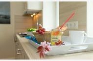 Die moderne, komplett ausgestattete Küche mit Backofen, Kühlschrank mit Gefrierfach, Geschirrspüler, Wasserkocher, Toaster und Kaffeemaschine ist harmonisch in den Wohnbereich integriert und bietet alles, was Familien für komfortable Urlaubstage benötigen. Das Appartement verfügt über zwei gleichwertige Schlafzimmer, jeweils mit einem Doppelbett (180 x 200 cm) und einem eigenen Flat-TV. Ein Schlafzimmer bietet direkten Zugang zum Südost-Balkon. Für Familien mit kleinen Kindern ist die zusätzliche Aufbettung im Babyreisebett (bis ca. 3 Jahre) möglich.