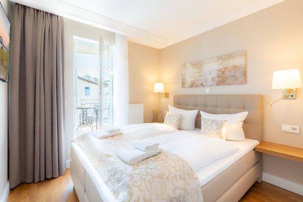 Das zweite Schlafzimmer verfügt ebenfalls über ein Boxspringbett (160 x 200cm / zwei getrennte Matratzen), TV und Staumöglichkeiten. Highlight hier ist der angrenzende Balkon. Genießen Sie von diesem die ersten Sonnenstrahlen des Tages bei einer guten Tasse Kaffee. Ein zweites Badezimmer mit bodengleicher Dusche und WC rundet den Urlaubskomfort für dieses Appartement hervorragend ab. Damit Sie Ihre wohlverdiente Urlaubszeit bereits am Anreisetag in vollen Zügen genießen können, haben wir das Bett für Sie und das für Ihre lieben Mitreisenden bereits bezogen und ein Duschtuch sowie ein kleines Handtuch bereitgelegt.