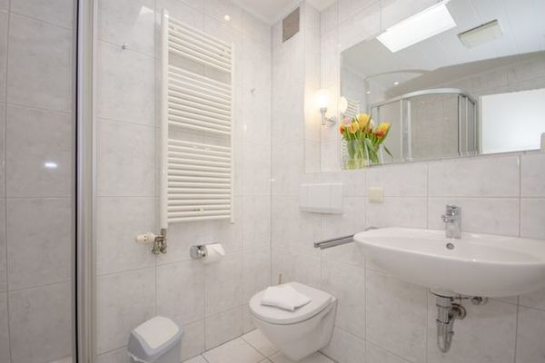 Das Badezimmer verfügt über eine Dusche, WC und einen Waschtisch mit großen Spiegel.