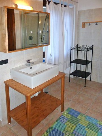 Im Obergeschoss erwarten die Gäste 2 Schlafzimmer und das helle Bad mit Dusche. Gemütlich wird es durch die Holzbalkendecken und die freundliche Möblierung.