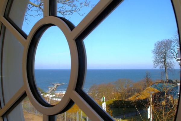 Wohn- und Essbereich im Wintergarten mit traumhaften Meerblick über die Seebrücke und den Strand