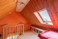 Schlafzimmer mit Doppelbett. Ein weiteres Zimmer gibt es im Dachgeschoss, welches über eine Raumspartreppe aus dem Wohn-/Essbereich erreichbar ist (Treppe ist relativ steil). Hier befinden sich zwei weitere Einzelbetten. Bad mit Waschbecken, Waschmaschine, Dusche und WC. Kleine, sonnige Dachloggia mit Gartenstühlen und Bistrotisch.