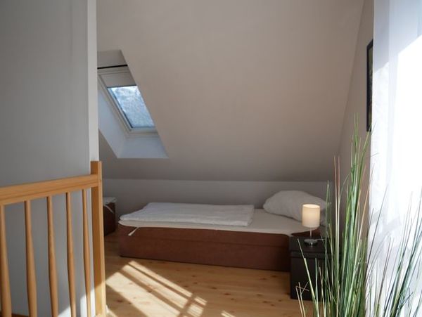 In das Obergeschoss gelangt man über eine offene Buchentreppe. Diese Etage ist offen gestaltet und in einen optisch abgetrennten Schlafbereich mit 2 Einzelbetten und einem großzügigen Wohnbereich mit Flat-TV und Schlafcouch (Aufbettungsmöglichkeit für die 5. Person) aufgeteilt.
