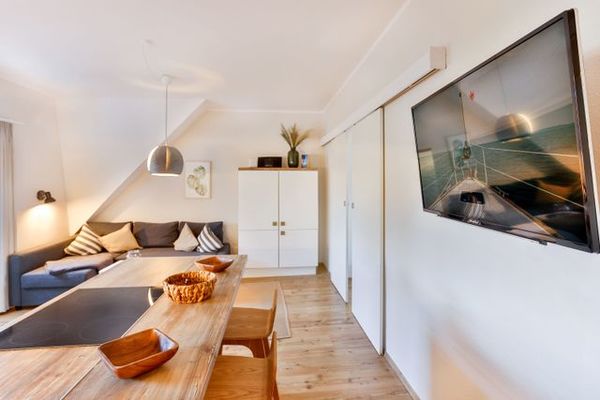 Die Wohnung liegt im 1.OG und verfügt über 2 getrennte Schlafzimmer mit jeweils 1 Doppelbett. Im Wohnzimmer befindet sich eine Schlafcouch für maximal 2 Personen. Bei Bedarf können auch 2 Babyreisebetten zur Verfügung gestellt werden.