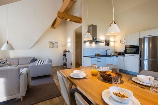 Die moderne und helle Ferienwohnung ist hochwertig ausgestattet. Sie verfügt über eine komplett eingerichtete Einbauküche mit Spülmaschine, Mikrowelle, Induktionsherd und großem Kühlraum mit separatem Gefrierabteil sowie Kaffeemaschine, Wasserkocher und Toaster. Ebenfalls verfügt die Wohnung über eine Waschmaschine. Der Wohnraum ist durch die ca. vier Meter hohe offene Decke geprägt und die fast 12m² große Dachterrasse bietet einen weiten Blick über die Felder, auf das Haff und Wasser. Das große Tageslichtbad ist mit einer bodentiefen Dusche mit Glasabtrennung ausgestattet. Das Hauptschlafzimmer verfügt über ein Doppelbett und das zweite Schlafzimmer über zwei Einzelbetten. Bei allen Betten handelt es sich um Boxspringbetten. Im Wohnzimmer, sowie in einem Schlafzimmer befinden sich jeweils ein Flachbildfernseher.