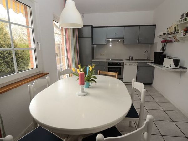 Man betritt das Haus über einen abgeschlossenen Windfang, der ausreichend Platz für Jacken und Schuhe bietet. Durch eine Terrassentür gelangt man in den gefliesten Wohnküchenbereich. Geradeaus führt eine offene Treppe in den Wohnbereich unter dem Dach und am anderen Ende des Raums befindet sich die Küchenzeile. Diese verfügt über einen Induktionsherd mit Backofen (eingebaut 2024), Kühlschrank mit integriertem Gefrierfach und einer Geschirrspülmaschine. Auf dem Ablageregal zur Rechten steht eine Kaffeemaschine, Wasserkocher und Toaster. In diesem Raum befindet sich weiterhin ein runder, ausziehbarer Esstisch mit fünf Stühlen und ein TrippTrapp Kinderstuhl, sowie ein Vorratsschrank unter der Treppe. Über eine Terrassentür links neben der Kochzeile gelangt man auf die Terrasse in Südlage,