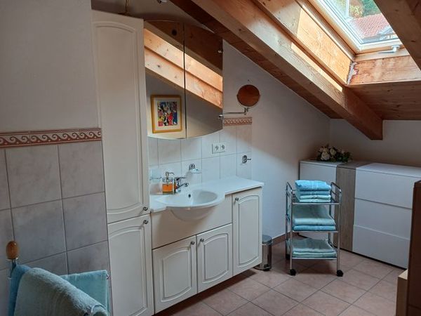 Über eine Treppe erreichen sie das Schlafzimmer und ein geräumiges Tageslichtbad mit Dusche.